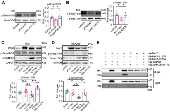 PAK2 regulates Smad9 phosphorylation to inhibit BMP signaling. A) The levels of p‐Smad1/5/9 (Ser 465) (F (2, 15) = 5.185, p = 0.019; for WT‐PAK2 versus PAK2‐P151S, p = 0.0185) in N2a cells transfected with WT‐PAK2 and PAK2‐P151S. n = 6 cultures for each group. B) The levels of p‐Smad1/5/9 (Ser 465) (F (2, 15) = 5.33, p = 0.018; for WT‐PAK2 versus PAK2‐E253A, p = 0.029) in N2a cells transfected with WT‐PAK2 and PAK2‐E253A. n = 6 cultures for each group. C) The levels of p‐Smad1/5/9 (Ser465) in N2a cells overexpressing WT‐PAK2, WT‐PAK2/WT‐SMAD9, and WT‐PAK2/SMAD9‐S417E plasmids. F (3, 28) = 7.393, p = 0.0009; for WT‐PAK2/WT‐SMAD9 versus WT‐PAK2/SMAD9‐S417E, p = 0.0004, n = 8 cultures for each group. D) The levels of p‐Smad1/5/9 (Ser465) in HEK293T cells overexpressing WT‐PAK2, WT‐PAK2/WT‐SMAD9, and WT‐PAK2/SMAD9‐S417E plasmids. F (3, 20) = 4.833, p = 0.011, WT‐PAK2/WT‐SMAD9 versus WT‐PAK2/SMAD9‐S417E, p = 0.025. n = 6 cultures for each group. E) Coimmunoprecipitation of Smad9 with PAK2, whereas SMAD9‐S417E, PAK2‐P151S, and PAK2‐E253A fail to interact with PAK2 and Smad9, respectively. One‐way ANOVA with Dunnett's multiple comparison test (A,B) and with Tukey's multiple comparison test (C,D).