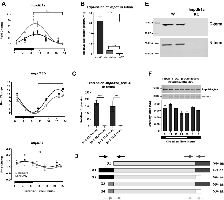 Impdh1a_tv1a is the predominant variant in the retina.A, relative expression levels of all transcript variants for impdh1a, 1b, and 2 throughout the day. For each graph, minimum expression = 1: impdh1a timepoints measured relative to 23:00, impdh1b relative to 9:00, and impdh2 relative to 15:00. The black and white bars indicate lights on (9:00) and lights out (23:00) for animals under normal light/dark cycle, $ denotes p ≤ 0.05 normal light/dark compared with dark only at 9:00. B, comparison of relative maximum expression levels of impdh1a (9:00), 1b (23:00), and 2 (5:00) transcripts. C, comparison of relative expression levels for all impdh1a transcripts detected in the retina at 9:00. N = 6 animals, the samples were in triplicate. D, schematic of impdh1a transcripts X1 to X4 and 544 (X0, Table 1 for primer/transcript information. E, Western blot of Impdh1a protein in WT and impdh1a23234 zebrafish retinas using antibodies that recognize either X1 and X3 (C-terminal) or X1 and X2 (N-terminal) N = 2. F, quantification of Impdh1a_tvX1 protein levels throughout the day using the C-terminal antibody, and inset shows representative Western blot with Ponceau S used as a loading control. Trend p =0.04, N = 2 animals per time point. N = 3 animals per time/data point for all other panels except where noted. impdh, inosine monophosphate dehydrogenase; tv, transcript variant. ns p > 0.05, ∗ p ≤ 0.05 , ∗∗ p ≤ 0.01, ∗∗∗ p ≤ 0.001, ∗∗∗∗ p ≤ 0.0001.