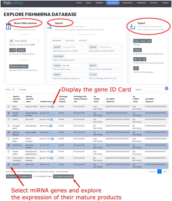 Fig. 2 Exploring the FishmiRNA Annotation database. Screen shot of the Annotation section of the database. Users can choose to add or remove columns in the display and can filter and search the database by species, miRNA gene and mature miRNA names, and orthology among species. The entire annotation database, or subsets of it, can be exported in various convenient formats. The magnifier icon opens the corresponding gene identification card that contains all the FishmiRNA information related to this gene. Selecting genes using tick boxes on the left allows the filtering of the FishmiRNA expression database for mature products of selected genes.
