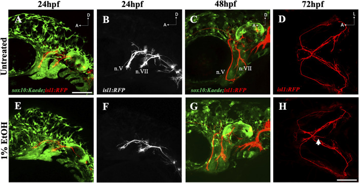 Ethanol does not affect early cranial nerve routing and pathfinding (A, B) Trigeminal nerve (n.V) and facial nerve (n.VII) extending towards BA (branchial arch)1 and BA2 in untreated sox10:Kaede;isl1:RFP embryo at 24hpf. (E, F) Normal extension of n. V and n. VII in ethanol-exposed sox10:Kaede;isl1:RFP embryos at 24hpf. (C, G) Untreated and ethanol-exposed sox10:Kaede;isl1:RFP fish at 48hpf. (D, H) Untreated and ethanol-exposed isl1:RFP fish at 72hpf. Arrow in H shows an extending ectopic nerve along the midline in ethanol-exposed fish. Scale bar = 100 um.