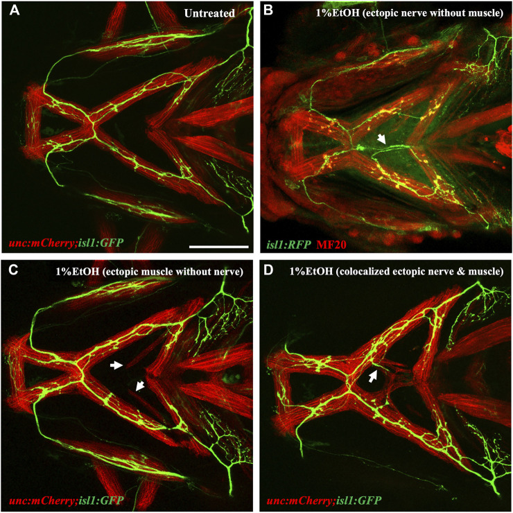 Ectopic nerve defects are independent of ectopic muscle defects (A) Untreated isl1:GFP;unc:mCherry showing muscles in red and motor nerves in green. (B) Ethanol-exposed isl1:RFP fish immunolabeled with anti-RFP (in green) and MF20 (in red). Arrow indicates ectopic nerve without ectopic muscle. (C) Ethanol-exposed isl1:GFP;unc:mCherry fish with ectopic muscle fibers without motor innervation. Arrows indicate ectopic muscle fibers. (D) Ethanol-exposed isl1:GFP;unc:mCherry fish with coexisting ectopic nerve and ectopic muscle indicated by the arrow. Scale bar = 100 um.