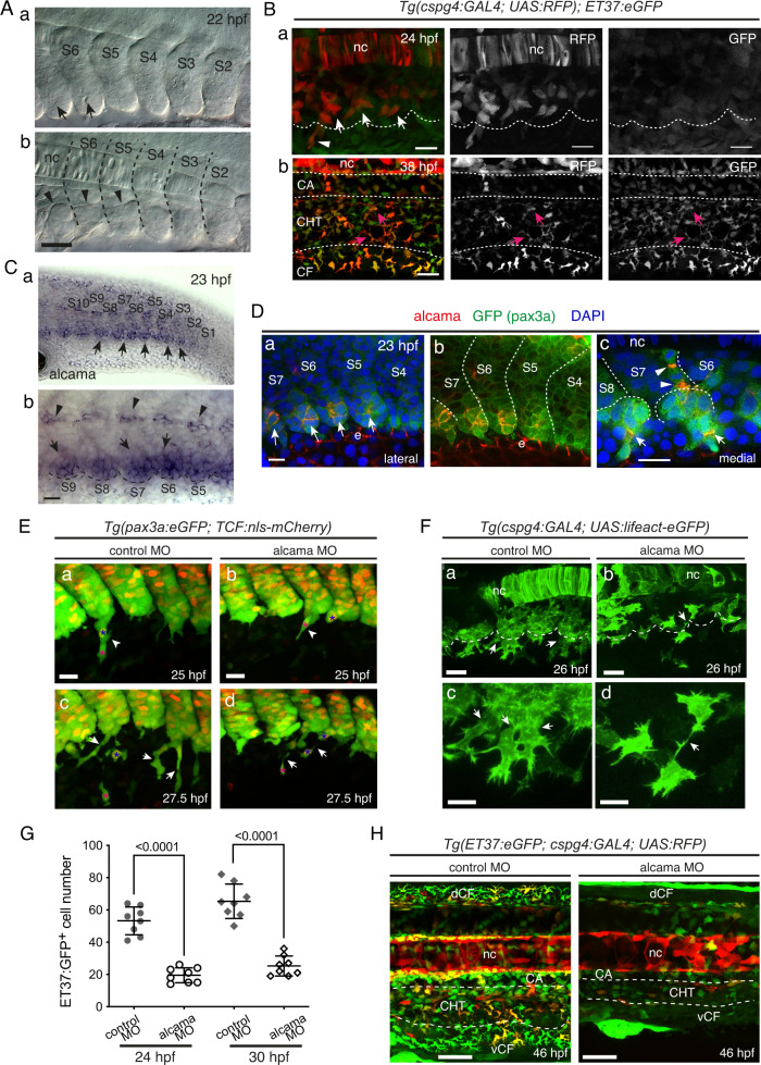 A VE-DIC microscopy of developing caudal somites at 22 hpf, rostral to the left, dorsal to the top. Somites are numbered S2–S6 according to their maturation stage. Lateral (a) and more medial (b) focal planes show the central lumen (a, arrows) formed within the ventral somite clusters, and the dorsal border of the clusters (b, arrowheads). Dashed lines indicate intersomitic boundaries. Scale bar, 40 µm. B Confocal projections of live Tg(cspg4:Gal4; UAS:RFP; ET37:eGFP) embryos at 24 (a) and 38 (b) hpf. a Arrows and arrowhead point at VC cells and an emerging SCP, respectively; the dotted line outlines the ventral border of caudal somites. Magenta arrows in b point at RFP/GFP double-positive cells in the CHT. Scale bars, 20 µm. C WISH for alcama at 23 hpf. Wide-area image of the tail (a) and magnified view of the ventral part of somites S5–S9 (b). Arrows and arrowheads point at somite VCs and cells prefiguring the horizontal myoseptum, respectively; a dotted line outlines the somite ventral border; scale bar, 20 µm. D Immunostaining for Alcama (red), pax3a:eGFP (green), together with DAPI (blue) at 23 hpf. a Overlay of red, blue and green signals; arrows point at Alcama labeling in the somite VCs. b Same image as a without DAPI staining; e epidermis. c At a deeper focal plane, strong Alcama signals were detected at contacts between cells migrating dorsal-wards (arrowheads) and ventral-wards (arrows); dashed lines delineate the VCs and somite borders. Scale bars, 20 µm. E Confocal maximum projections of control or alcama MO-injected Tg(pax3a:eGFP; TCF:nls-mCherry) embryos at 25 (a, b) and 27.5 (c, d) hpf. (a, b) Arrowheads show SCPs beginning to emigrate; magenta and blue asterisks point to the same cells as in (c) and (d), respectively. c, d Arrows point at intercellular junctions of migrating SCPs. n = 12 for each condition from four independent experiments. Scale bars, 25 µm. F Confocal projections of control or alcama MO-injected Tg(cspg4:Gal4; UAS:Lifeact-eGFP) at 26 hpf. Dashed lines indicate the somite ventral borders. Arrows point at connections between migrating SCPs. Magnified images are shown in (c) and (d). n = 9 for each condition from three independent experiments. Scale bars, 20 µm. G Quantification of ET37:eGFP+ cells in the ventral tail of live control and alcama MO-injected embryos, at 24 and 30 hpf over a 5-somites width (n = 8 embryos each; mean ± SD; two-tailed Student’s t-test, Source data are provided as a Source Data file). At 24 hpf, all GFP+ cells ventral to the notochord were counted; at 30 hpf, all GFP+ cells ventral to the somites were counted. H Confocal projections of control or alcama MO-injected Tg(ET37:eGFP; cspg4:Gal4; UAS:RFP) embryos at 46 hpf. Dashed lines delineate the CHT. n = 10 for each condition from a single experiment. Scale bars, 50 µm. nc notochord, CA caudal artery, CHT caudal hematopoietic tissue, vCF and dCF ventral and dorsal caudal fin.