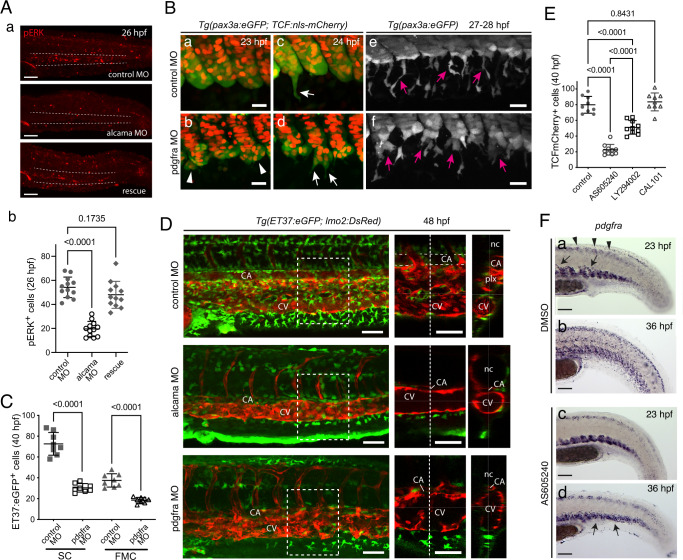 A (a) Immunofluorescence for pERK at 26 hpf in the tail region of embryos injected with control MO, alcama MO, or alcama MO + alcama mRNA (“rescue”); n = 12 embryos from two independent experiments. Dashed lines indicate the CHT border. b Quantification of a (n = 12 embryos for each group; mean ± SD; one-way ANOVA followed by Dunnett’s multiple comparison test). B Confocal projections of live control (a, c, e) or pdgfra (b, d, f) MO-injected Tg(ET37:eGFP; TCF:nls-mCherry) embryos from 23 to 28 hpf. Arrowheads point at cohesion defects observed in the VCs of pdgfra MO-injected embryos. White and magenta arrows indicate emerging (c, d) and migrating (e, f) SCPs, respectively; n = 9 for each condition from three independent experiments. Scale bars, 25 µm. C Quantification of ET37:eGFP+ stromal cells and FMCs in control and pdgfra MO-injected embryos at 40 hpf (n = 8 for each group, from the same experiment; mean ± SD; two-tailed Student’s t-test). D Confocal maximum projections of control, alcama, and pdgfra MO-injected Tg(ET37:eGFP; lmo2:DsRed) embryos at 48 hpf. An enlarged view of the area enclosed by the dashed square is shown in the middle panel (single slice image), where a dotted vertical line shows the position of the orthogonal projection (transverse section) shown in the right panel; n = 6 for each condition from three independent experiments. Scale bars, 50 µm. E Quantification of TCF:nls-mCherry+ stromal cells in the CHT of control embryos (n = 9), or embryos treated from 20 hpf with AS605240 (n = 10), LY294002 (n = 10), or CAL101 (n = 9) at 40 hpf (mean ± SD; one-way ANOVA followed by Tukey’s multiple comparison test). F WISH for pdgfra at 23 and 36 hpf in 0.2% DMSO (control) and AS605240-treated embryos. Arrows and arrowheads in (a) indicate VC cells migrating toward the notochord and dorsal mesenchymal cells at 23 hpf, respectively. Arrows in d show SCPs slightly dispersed around the VCs at 36 hpf. n = 12 for each condition from two independent experiments. CA caudal artery, CV definitive caudal vein, Plx venous plexus, nc notochord. Source data for A-b, C, and E are provided as a Source Data file.