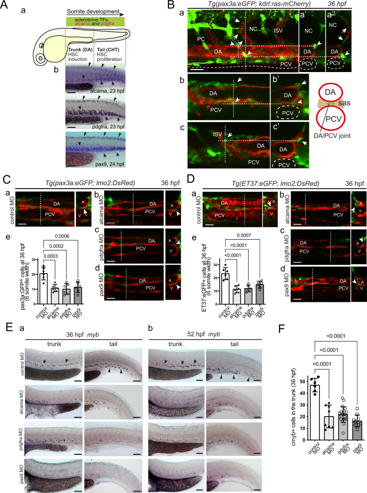 A (a) Rostro-caudal extent of sclerotomal TFs and alcama and pdgfra expression by 24 hpf. b WISH for alcama, pdgfra, and pax9 at 23–24 hpf. Arrows point at their expression in the somite VCs/sclerotome in the trunk and tail. Arrowheads point at their expression in the smaller dorsal sclerotome15. B Confocal maximum projection (a) and single confocal sections (b, c) of the trunk region of a Tg(pax3a:eGFP; kdrl:ras-mCherry) embryo at 36 hpf, with vertical dashed lines showing the position of the optical transverse sections shown on the right (a’, a”, b’, c’). Arrowheads point at GFP+ stromal cells located at the DA/notochord or DA/PCV junction, arrows point at ISV-associated mesenchymal cells, known to originate from the dorsal-wards migration of ventral sclerotome cells12,15. Scale bar, 20 µm. C, D Confocal sections of the trunk region of Tg(pax3a:eGFP; lmo2:DsRed) (C) and Tg(ET37:eGFP; lmo2:DsRed) (D) embryos injected with control (a), alcama (b), pdgfra (c), or pax9 (d) MOs. Dashed lines indicate the position of the corresponding transverse section shown on the right. Arrows and arrowheads point at stromal cells located at the DA/PCV joint or somewhat lateral to it, respectively. e Quantification of pax3a:eGFP+ (C) or ET37:eGFP+ (D) cells in the sub-aortic space of 36 hpf live embryos injected with control, alcama, pdgfra or pax9 MO (mean ± SD; n = 6 embryos for each group. One-way ANOVA followed by Dunnett’s multiple comparison test). Counting was done over a 6-somite width. Scale bars, 20 µm. E WISH for myb at 36 (a) and 52 (b) hpf in embryos injected with control, alcama, pdgfra, or pax9 MO. Arrows and arrowheads point at myb+ signals in the trunk (arrows) and tail (arrowheads) regions, respectively. a Representative images of n = 6, 8, 20, and 10 injected embryos for control, alcama, pdgfra, and pax9 MO, respectively, from two independent experiments. b Representative images of n = 6 for each condition, from two independent experiments. Scale bars, 100 µm. F Quantification of myb+ cells at 36 hpf as shown in (E-a) (mean ± SD; n = 6 embryos for control, 8 for alcama, 20 for pdgfra, and 10 for pax9 MO-injected embryos. One-way ANOVA followed by Dunnett’s multiple comparison test). DA or A dorsal aorta, PCV or V posterior cardinal vein, ISV intersomitic vessel, sas sub-aortic space. Source data for C-e, D-e, and F are provided as a Source Data file.
