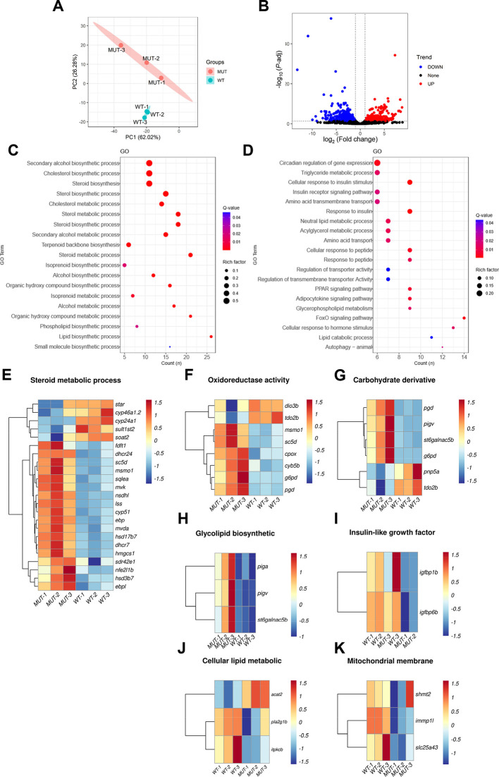 A: PCA cluster analysis of WT and mutant zebrafish liver samples. B: Volcano plot showing DEGs in two sets of samples, where blue represents down-regulated genes, red represents up-regulated genes, black represents genes with no significant difference, and each point represents a gene. C: KEGG analysis of up-regulated DEGs showing significantly enriched pathways D: KEGG analysis of down-regulated DEGs showing significantly enriched pathways. E: Heatmap of DEGs associated with steroid metabolism. F: Heatmap of DEGs associated with oxidoreductase activity. G: Heatmap of DEGs associated with carbohydrate derivative. H: Heatmap of DEGs associated with glycolipid biosynthesis. I: Heatmap of DEGs associated with insulin-like growth factor binding. J: Heatmap of DEGs related to cellular lipid metabolism. K: Heatmap of mitochondrial membrane-associated DEGs.