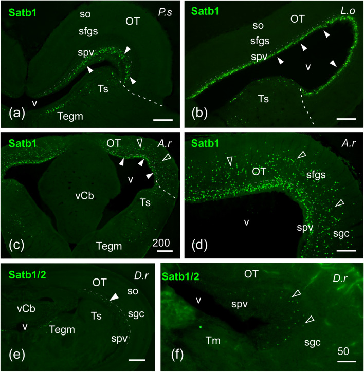 Photomicrographs of transverse single-labeled sections through mesencephalic areas of Polypterus senegalus (P.s), Lepisosteus oculatus (L.o), Acipenser ruthenus (A.r), and Danio rerio (D.r) showing the location of SATB1/2 or SATB1 immunoreactivity. The markers and the species are indicated in each image. a–f SATB1-ir cells in the periventricular layer of the optic tectum (spv), torus semicircularis and tegmentum of P. senegalus (a), L. oculatus (b), and A. ruthenus (c, d), the latter also with labeled cells in more superficial layers of the optic tectum; white arrowheads point to cells in spv, empty arrowheads in (c) and (d) point to cells in other tectal layers. e, f SATB1/2-ir cells in the optic tectum and tegmentum of D. rerio; arrowheads point to periventricular cells. For abbreviations, see list. Scale bars = 200 µm (c), 100 µm (a, b, d, e), 50 µm (f)