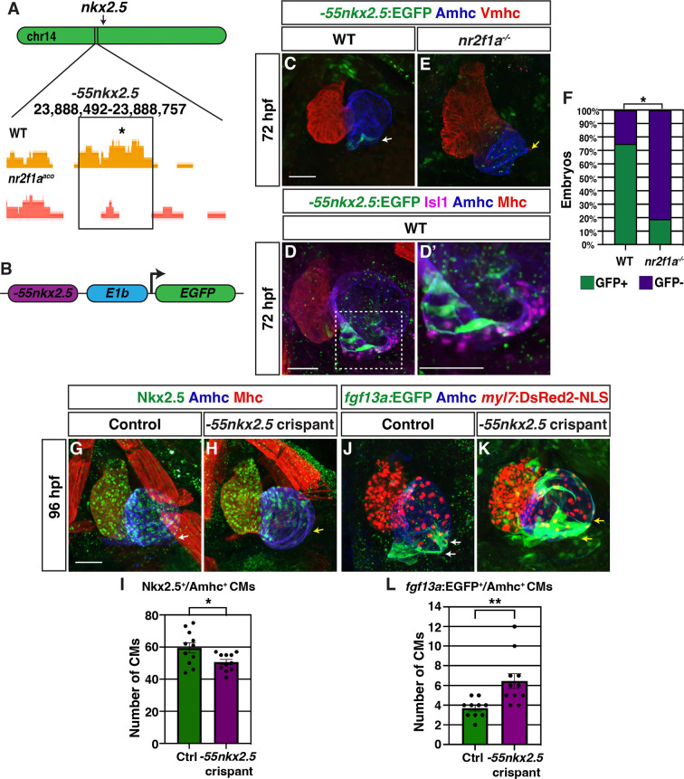 (A) Comparison of assay for transpose-accessible chromatin sequencing (ATAC-seq) peaks from wild-type (WT) and nr2f1a mutant amhc:EGFP+ cardiomyocytes at 48 hr post-fertilization (hpf), ~55 kb upstream of nkx2.5. Asterisk denotes canonical Nr2f binding site. (B) Schematic of –55 kb nkx2.5 enhancer reporter construct. (C) IHC for Tg(–55nkx2.5:EGFP) enhancer (green), Amhc (blue), and Vmhc (red) in hearts at 72 hpf. White arrow indicates –55nkx2.5:EGFP expression. (D–D’) IHC for –55nkx2.5:EGFP (green), Isl1 (purple), Amhc (blue), and sarcomeric myosin heavy chain (Mhc: pan-cardiac - red). The transgenic enhancer reporter is expressed in the ACs directly adjacent to the Isl1+ pacemaker cardiomyocytes (PCs). (E) IHC for Tg(–55nkx2.5:EGFP) enhancer (green), Amhc (blue), and Vmhc (red) in an nr2f1a mutant heart at 72 hpf. Expression of transgenic enhancer reporter is lost in nr2f1a mutants. Yellow arrow indicates venous pole devoid of –55nkx2.5:EGFP expression. (F) Comparison of percentage of WT and nr2f1a mutant embryos with –55nkx2.5:EGFP expression in the heart at 72 hpf WT (n=16); nr2f1a-/- (n=16), using Fisher’s exact test. (G,H) IHC for Nkx2.5 (green), Amhc (purple), and Mhc (red) in uninjected control and –55nkx2.5 crispant embryo hearts at 96 hpf. White arrow in (G) indicates the border of Nkx2.5+ cardiomyocytes extends close to the venous pole. Yellow arrow in (H) indicates that the Nkx2.5+ cardiomyocyte border is located farther from the venous pole of the atrium in crispant embryos. (I) Quantification of Nkx2.5+/Amhc+ cardiomyocytes in uninjected control (n=11) and –55nkx2.5 crispant (n=11) embryos at 96 hpf. (J,K) IHC for fgf13a:EGFP (green), Amhc (blue), and myl7:DsRed2-NLS (red) in uninjected control and –55nkx2.5 crispant Tg(fgf13a:EGFP)+ embryo hearts at 96 hpf. White arrows in (J) indicate the region of fgf13a:EGFP+ cardiomyocytes at the venous pole. Yellow arrows in (K) indicates that the region of fgf13a:EGFP+ cardiomyocytes is expanded from the venous pole in the atrium of crispant embryos. (L) Quantification of fgf13a:EGFP+/Amhc+ cardiomyocytes in uninjected control (n=10) and –55nkx2.5 crispant (n=11) embryo hearts at 96 hpf. Differences between uninjected control and –55nkx2.5 crispants were analyzed using Student’s t-test. Error bars indicate s.e.m. *p=0.05–0.001, **p<0.001. Scale bars in all images indicate 50 μm.