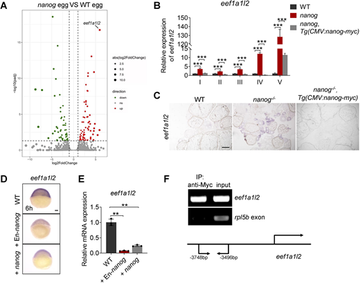 Fig. 3 Nanog transcriptionally inhibits the expression of eef1a1l2. (A) RNA-seq analysis showing significantly increased expression of eef1a1l2 in nanog null eggs. Red dots indicate upregulated genes, green dots indicate downregulated genes, and gray dots indicate genes that were not differentially expressed in nanog mutant eggs. (B) Detection of eef1a1l2 expression in nanog mutant oocytes at different stages revealed by RT-qPCR. ***P<0.001. n=3. (C) Detection of eef1a1l2 expression in ovaries of WT, nanog mutant, and Tg(CMV:nanog-myc) in nanog mutant background by in situ hybridization on cryosections. Scale bar: 200 μm. (D,E) WISH (D) and RT-qPCR (E) analysis showed reduced expression of eef1a1l2 in nanog or En-nanog overexpressed embryos at 6 hpf. Images in D are representative of 36/36 embryos for WT, 38/39 for +EN-nanog and 32/32 for +nanog. **P<0.01. n=3. Scale bar: 100 μm. (F) ChIP analysis of Tg(CMV:nanog-myc) ovaries with anti-Myc antibody at 6 months post-fertilization. The promoter region of eef1a1l2 was enriched in precipitated chromatin. rpl5b served as a negative control. Schematic depicts the genomic sequence of eef1a1l2, and the sequence located between −3748 and −3496 bp upstream of the amplified region.