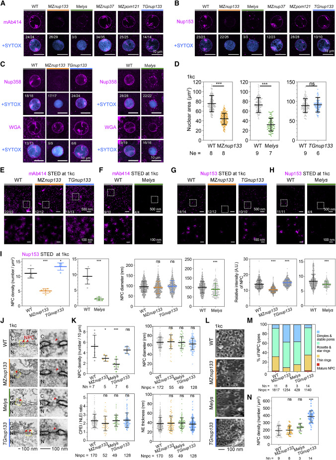 Figure 5. Impact of nup133 or elys mutation and nup133 overexpression on NPC assembly (A–C) Representative immunofluorescence images of NPC signals in nuclei detected by specific antibodies or WGA at 1kc stage. TGnup133, Tg(ef1α:nup133-GFP). The fraction of nuclei with representative signal pattern was indicated. (D) Average nuclear area in embryos of different backgrounds at 1kc stage. Ne, embryo number. Significant differences were considered as follows: ns, nonsignificance, p ≥ 0.05; ∗, p < 0.05; ∗∗, p < 0.01; ∗∗∗, p < 0.001. (E–H) STED microscopic images of individual NPCs labeled with mAb414 or Nup153 at 1kc stage. (I) Nup153-labeled NPC parameters based on STED images at 1kc stage in (G) and (H). Significant differences were considered as follows: ns, nonsignificance, p ≥ 0.05; ∗, p < 0.05; ∗∗, p < 0.01; ∗∗∗, p < 0.001. (J and K) TEM-detected NPCs in nuclei of embryos at 1kc. Representative images of NPCs (indicated by red arrowheads) were shown in (J). NE, nuclear envelope; N, nucleus; C, cytoplasm; Nn, nuclei number; Nnpc, NPC number. (K) Significant differences were considered as follows: ns, nonsignificance, p ≥ 0.05; ∗, p < 0.05; ∗∗, p < 0.01; ∗∗∗, p < 0.001. (L–N) Representative FESEM images of isolated nuclear surface embedded with NPCs (L), ratio of NPC types (M), and NPC density (N) in different types of embryos at 1kc stage. Each dot in (N) represented one measurement in a region of interest (ROI). (N) Significant differences were considered as follows: ns, nonsignificance, p ≥ 0.05; ∗, p < 0.05; ∗∗, p < 0.01; ∗∗∗, p < 0.001. See also Figure S4.