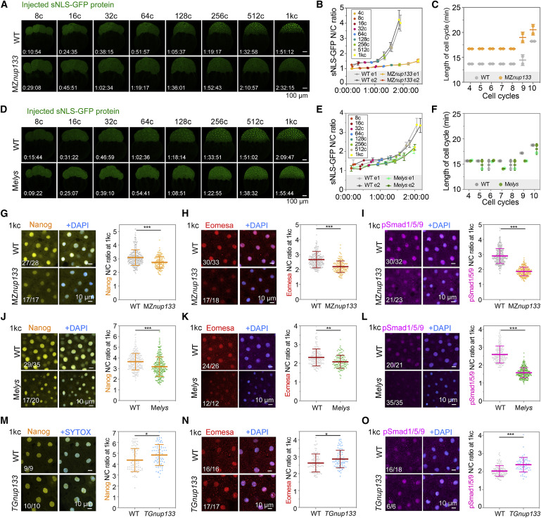Figure 6. Impact of nup133 or elys mutation and nup133 overexpression on nuclear transport of TFs (A–F) Nuclear transport dynamics of microinjected sNLS-GFP protein in MZnup133 (A–C) or Melys (D–F) mutants. 2 ng/embryo sNLS-GFP protein was microinjected at 1c for analysis. The relative time was referred to the start of live-cell imaging. (G–O) Nuclear accumulation of Nanog (G, J, and M), Eomesa (H, K, and N) and pSmad1/5/9 (I, L, and O) and their N/C ratios in 1kc-stage embryos of different genetic backgrounds. Significant differences were considered as follows: ns, nonsignificance, p ≥ 0.05; ∗, p < 0.05; ∗∗, p < 0.01; ∗∗∗, p < 0.001. See also Figure S4 and Videos S5 and S6.