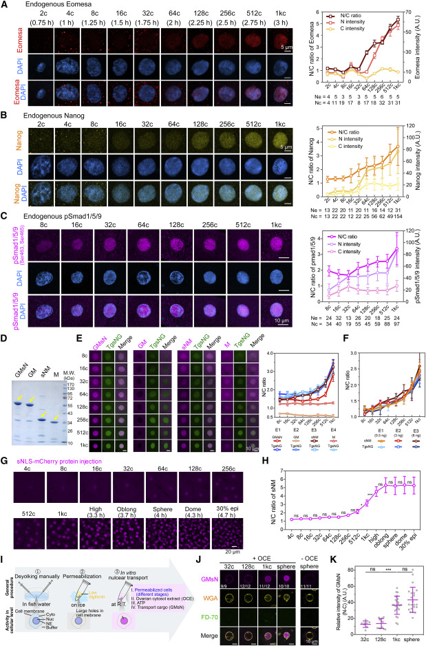 Figure 2. Dynamic nuclear transport of nuclear proteins in zebrafish early embryos (A–C) Nuclear accumulation of endogenous maternal TFs Eomesa (A), Nanog (B), and pSmad1/5/9 (C) in embryos at indicated stages (or time postfertilization). Left panel, representative images in the nucleus (DAPI-positive) in embryos at indicated stages. Right panel, quantified signal intensity in the nucleus (N) and cytoplasm (C) and N/C ratio. Ne, embryo number; Nc, cell number. The data were shown as mean ± SEM (A) or mean ± SD (B and C, also for other data unless otherwise stated). a.u., arbitrary units. (D–F) Dynamic nuclear transport of microinjected proteins. Purified proteins expressed in E. coli were indicated by yellow arrows (D). 1c-stage Tg(ef1α:sNLS-GFP) embryos were injected with 2 ng of indicated protein (E) or indicated dosage of sNM (F). TgsNG, Tg(ef1α:sNLS-GFP). Injected proteins: GMsN, GST-mCherry-sNLS; GM: GST-mCherry; sNM, sNLS-mCherry; M, mCherry. (G and H) Nuclear transport dynamics of sNLS-mCherry protein beyond MBT stages. 2 ng sNLS-mCherry protein was microinjected at one-cell stage. (H) Significant differences were considered as follows: ns, nonsignificance, p ≥ 0.05; ∗, p < 0.05; ∗∗, p < 0.01; ∗∗∗, p < 0.001. (I–K) In vitro nuclear transport assay results. (I) Schematic illustration of the assay. See also STAR Methods. (J) Representative images of GST-mCherry-sNLS protein (GMsN, import cargo) and 70-kDa FITC-labeled dextran (FD-70, negative control) in the nucleus as well as WGA-stained Nups on NE. (K) Significant differences were considered as follows: ns, nonsignificance, p ≥ 0.05; ∗, p < 0.05; ∗∗, p < 0.01; ∗∗∗, p < 0.001. See also Figures S1 andS2 and Videos S1