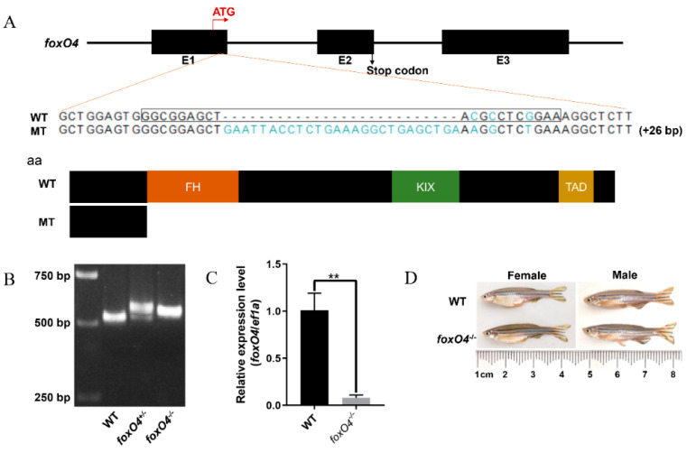 Generation of foxO4−/− zebrafish via CRISPR/Cas9 technology. (A) The DNA sequence and predicated protein product difference in foxO4 between the mutants and WT. sgRNA sequence is marked with a black box. The green letters in MT represent the mutated DNA sequence. (B) Verification of zebrafish