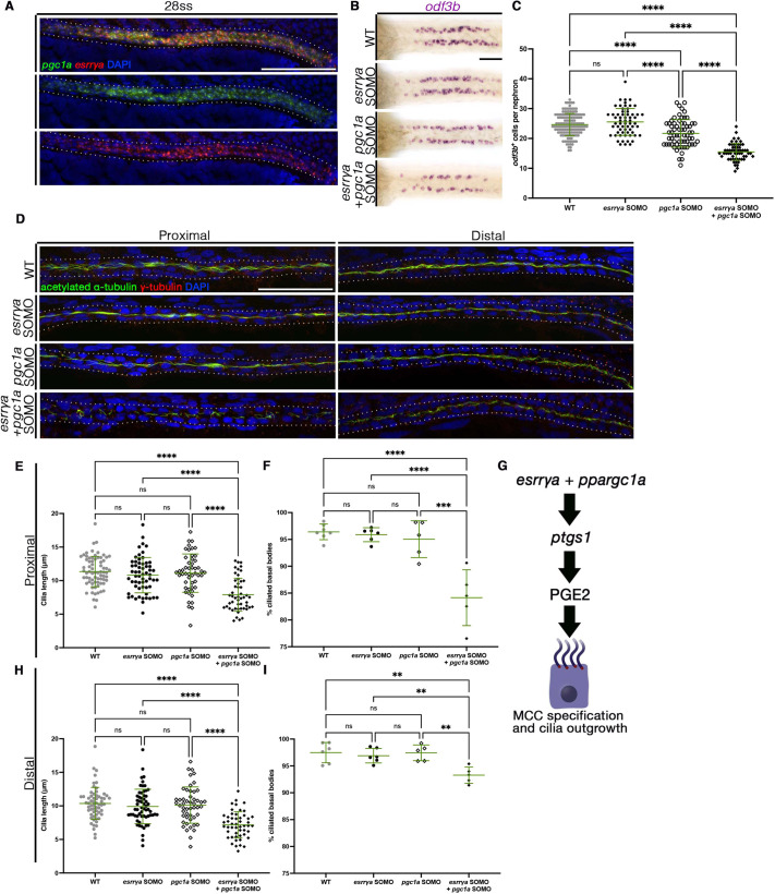 Genetic interaction of esrrγa and pgc1a drives MCC specification and ciliogenesis. (A) FISH reveals that esrrγa colocalizes with pgc1a in 24 hpf WT zebrafish. (B) MCCs stained via WISH (odf3b). (C) MCCs per nephron. Each dot represents one nephron. Two nephrons were measured per animal. (D) IF for indicated markers at 28 hpf. Dotted lines indicate nephron tubule. (E,H) Cilia length in proximal (E) and distal (H) pronephros. Each dot represents one cilium. Ten cilia were measured per animal. WT n=6, esrrγa SOMO n=6, pgc1a SOMO n=5, esrrγa and pgc1a SOMO n=5. (F,I) Percentage of ciliated basal bodies in proximal (F) and distal (I) pronephros. Each dot represents an individual. (G) esrrγa and pgc1a cooperate upstream of ptgs1 and PGE2 production to regulate MCC cell fate and ciliogenesis. Data are mean±s.d. **P<0.01, ****P<0.0001 (one-way ANOVA). ns, not significant. Scale bars: 50 µm.