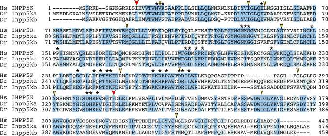 Protein alignment of INPP5K, Inpp5ka, and Inpp5kb highlighting conserved amino acids required for phosphatase activity. The start and end of the catalytic domain in the human protein are marked with large red arrowheads. Amino acids required for phosphatase activity have been denoted with asterisks (*). Small arrowheads indicate residues that are altered by missense variants in humans. Hs,