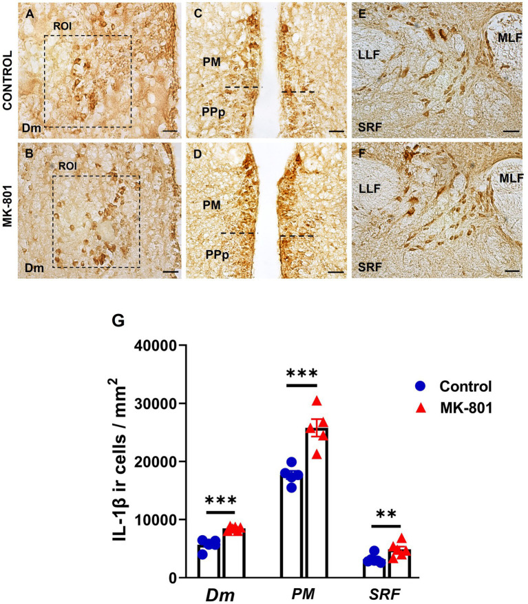Excessive IL-1β expression within the SDMN and SRF, in MK-801 treated zebrafish displaying social withdrawal and anxiety-like behavior. (A–F) Representative staining for IL-1β in (A,B) medial zone of the dorsal telencephalic area (Dm), (C,D) magnocellular preoptic nucleus and (E,F) superior reticular formation (SRF) of control and MK-801 treated fish. Scale bar: 25 μm. (G) The density of IL-1β positive cells were significantly increased in MK-801 treated zebrafish, in Dm, PM and SRF, compared to control group. Bars represent the number (mean ± SEM) of IL-1β positive cells. n = 5 per experimental group. **p ≤ 0.01, ***p ≤ 0.001, compared to control group.