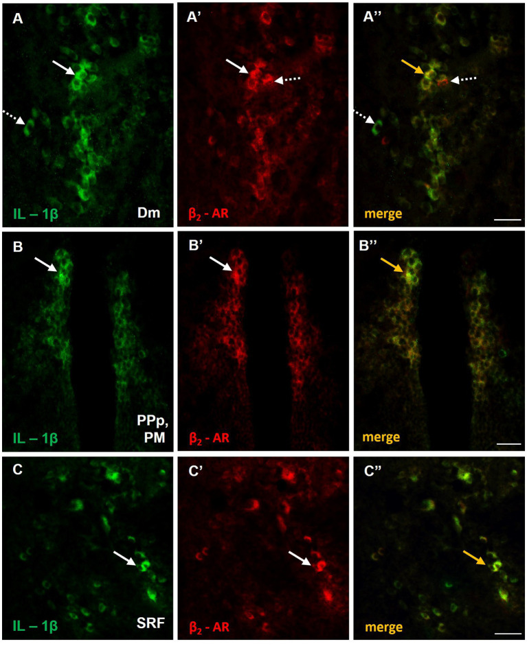 Possible noradrenergic regulation of IL-1β expression through β2-adrenoceptors (β2-ARs) activation within areas of the SDMN. (A–C’’) Immunofluorescent microphotographs of selected transverse sections showing colocalization of IL-1β with β2-ARs in (A–A’’) medial zone of the dorsal telencephalic area (Dm), (B–B’’) parvocellular preoptic nucleus, posterior part/magnocellular preoptic nucleus (PPp, PM), and (C–C’’) superior reticular formation (SRF). Arrows indicate examples of colocalization, dashed arrows point to single positive cells. Microphotographic images are representative of MK-801-treated fish, n = 5. Scale bar: 25 μm.