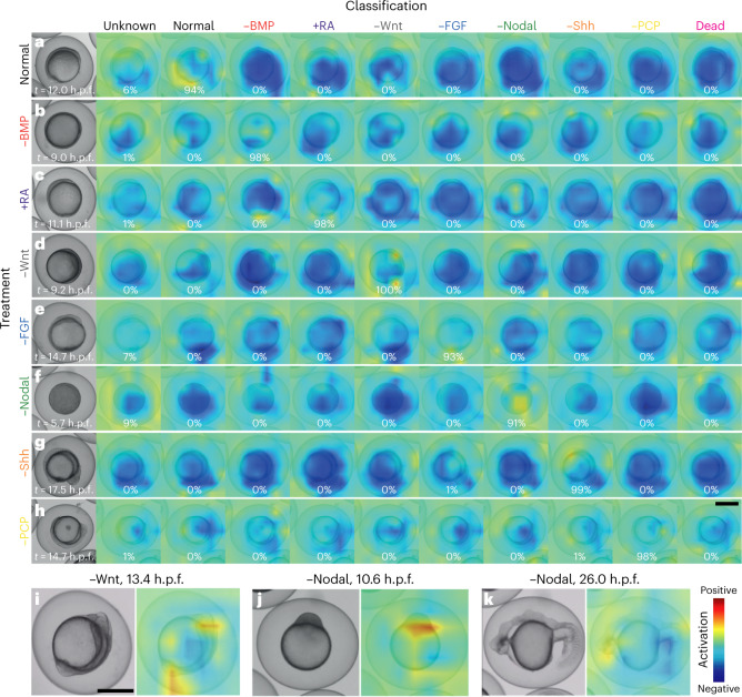 Class activation heatmaps based on the last convolutional layer of EmbryoNet-Prime showing the part of the image that activates the network at the given timepoint for normal (
