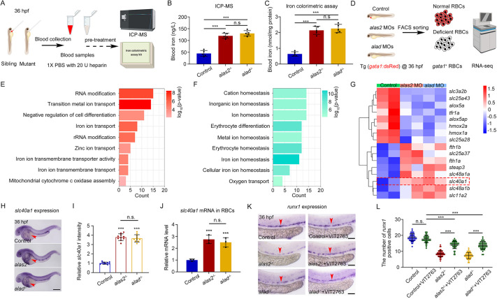 Blood IOL phenotype is caused by heme-deficient RBCs via Slc40a1. (A) Workflow of blood iron measurement in control, alas2−/− and alad−/− at 36 hpf by ICP-MS or iron colorimetric assay kit. (B,C) Quantification of the blood iron content by ICP-MS (B) and iron colorimetric assay kit (C). n=5 experimental replicates. (D) Schematic of bulk RNA-seq of flow cytometry-sorted gata1+ RBCs in alas2 and alad morphants at 36 hpf on Illumina NovaSeq 6000 platform. (E,F) GO analysis showing the enrichment of upregulated (E) and downregulated (F) overlapping terms in heme-deficient RBCs of alas2 and alad morphants. (G) Heatmap analysis of selected overlapping DEGs in iron transportation-related GO terms. The iron exporter Slc40a1 is highlighted with red dashed rectangle. (H) The expression of slc40a1 is detected by WISH in control, alas2−/− and alad−/− at 36 hpf. The RBC-enriched yolk regions are denoted by red arrowheads. (I) Statistical analysis of the relative slc40a1 expression in H by ImageJ. n (embryos)=10. (J) Relative mRNA level of slc40a1 in the flow cytometric-sorted RBCs (gata1+) of control, alas2−/− and alad−/− at 36 hpf examined by qRT-PCR. n=3 experimental replicates. (K) Expression of HSPC marker gene runx1 in control, alas2−/− and alad−/− with or without VIT2763 treatment at 36 hpf examined by WISH. The AGM regions for marker gene-positive cell counting are denoted by red arrowheads. (L) Quantification of the runx1-positive HSPCs in K. n=3 experimental replicates. Number of samples are indicated. Data are mean±s.d. ***P<0.001 (one-way ANOVA, Tukey's multiple comparisons). n.s., not significant. Scale bars: 250 μm (H); 100 μm (K).