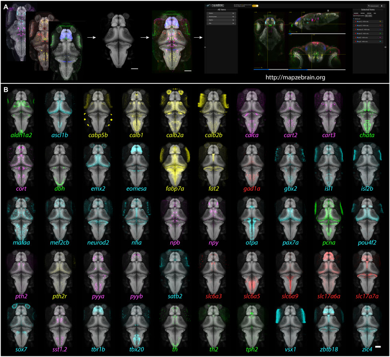 (A) Multiplexed FISH was performed on 6-dpf Tg(elavl3:H2b-GCaMP6s) fish. The GCaMP6s signal was used to align the images to the reference brain, and the aligned images were then uploaded to the mapzebrain atlas. Scale bar, 100 μm. (B) 3D projections of 50 selected FISH images, registered into the standard brain. Color coding: green, enzymes; cyan, transcription factors; red, neurotransmitter synthesizing enzyme (GABAergic) and transmitter transporters (glutamatergic); magenta, neuropeptides; yellow, miscellaneous other. Scale bar, 100 μm.