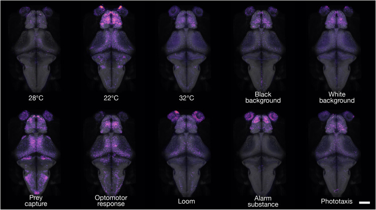 3D projections of cfos FISH-labeled areas of neuronal activity during behavior. Dorsal views are shown for each experimental condition. For interactive viewing, spanning the full depth of the brain, see mapzebrain atlas at https://mapzebrain.org/. Scale bar, 100 μm.