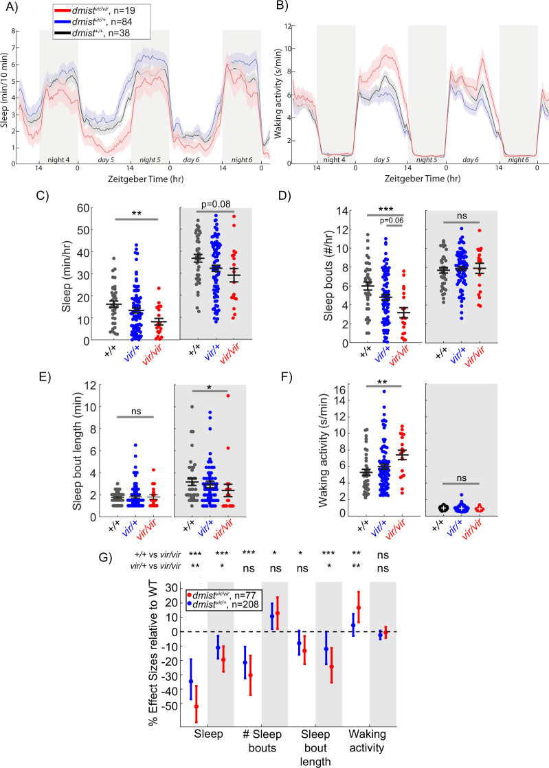 Figure 1 A viral insertion mini-screen identifies a short-sleeping mutant, dreammist. (A, B) Mean ± SEM sleep (A) and waking activity (B) of progeny from dmistvir/+ in-cross from original screen. White blocks show day (lights on) and grey blocks show night (lights off). Data is combined from two independent experiments. n indicates the number of animals. (C–F) Analysis of sleep/wake architecture for the data shown in (A, B). (C) Quantification of total sleep across 2 d and nights shows decreased day and night sleep in dmistvir/vir. Analysis of sleep architecture reveals fewer sleep bouts during the day (D) and shorter sleep bouts at night (E) in dmistvir/vir compared with sibling controls. (F) Daytime waking activity is also increased in dmistvir/vir. The black lines show the mean ± SEM, except in (E), which labels the median ± SEM. *p<0.05, **p<0.01, ***p<0.001; ns p>0.05; one-way ANOVA, Tukey’s post hoc test. (G) Combining five independent experiments using a linear mixed effects model with genotype as a fixed effect and experiment as a random effect reveals dmistvir/vir larvae have decreased total sleep and changes to sleep architecture during both the day and night compared to dmist+/+ siblings. Plotted are the genotype effect sizes (95% confidence interval) for each parameter relative to wild type. Shading indicates day (white) and night (grey). p-Values are assigned by an F-test on the fixed effects coefficients from the linear mixed effects model. *p<0.05, **p<0.01, ***p<0.001, ns p>0.05. n indicates the number of animals.