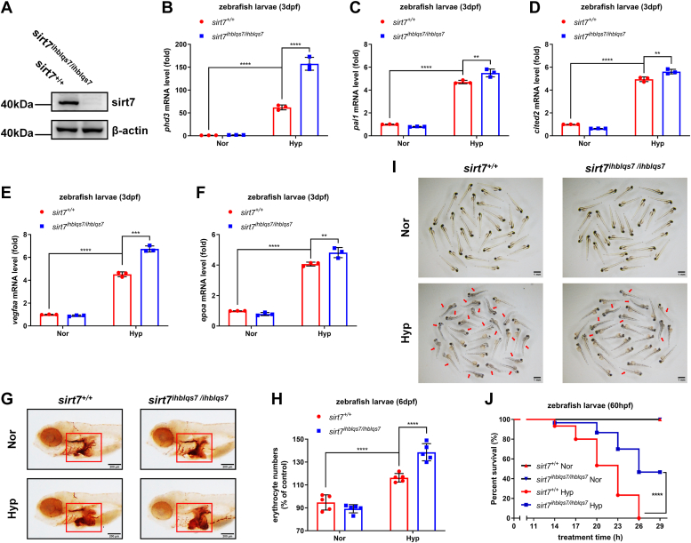 sirt7-null zebrafish larvae (sirt7ihblqs7/ihblqs7) are more tolerant to hypoxia.A, Western blot analysis of sirt7 expression in sirt7-null mutant (sirt7ihblqs7/ihblqs7) and the wildtype sibling (sirt7+/+) (3 dpf). B, quantitative real-time PCR (qPCR) analysis of phd3 mRNA in sirt7-null mutant (sirt7ihblqs7/ihblqs7) and the wildtype sibling (sirt7+/+) (3 dpf) under normoxia (Nor) and hypoxia (Hyp). C, qPCR analysis of pai1 mRNA in sirt7-null mutant (sirt7ihblqs7/ihblqs7) and the wildtype sibling (sirt7+/+) (3 dpf) under normoxia (Nor) and hypoxia (Hyp). D, qPCR analysis of cited2 mRNA in sirt7-null mutant (sirt7ihblqs7/ihblqs7) and the wildtype sibling (sirt7+/+) (3 dpf) under normoxia (Nor) and hypoxia (Hyp). E, qPCR analysis of vegfaa mRNA in sirt7-null mutant (sirt7ihblqs7/ihblqs7) and the wildtype sibling (sirt7+/+) (3 dpf) under normoxia (Nor) and hypoxia (Hyp). F, qPCR analysis of epoa mRNA in sirt7-null mutant (sirt7ihblqs7/ihblqs7) and the wildtype sibling (sirt7+/+) (3 dpf) under normoxia (Nor) and hypoxia (Hyp). G, o-dianisidine staining of erythrocytes in sirt7-null mutant (sirt7ihblqs7/ihblqs7) and the wildtype sibling (sirt7+/+) (6 dpf) under normoxia (Nor) and hypoxia (Hyp). H, quantitation of erythrocytes in (G) as determined by normalizing the intensities of o-dianisidine-stained cells. I, photographs of sirt7-null mutant (sirt7ihblqs7/ihblqs7) and the wildtype sibling (sirt7+/+) (3 dpf) under normoxia (Nor) and hypoxia (Hyp). J, survival curve of sirt7-null mutant (sirt7ihblqs7/ihblqs7) and the wildtype sibling (sirt7+/+) (3 dpf) under normoxia (Nor) and hypoxia (Hyp). p Values were calculated by two-way ANOVA analysis (B, C, D, E, F, and H) or log-rank test (J); ∗∗p < 0.01, ∗∗∗p < 0.001, and ∗∗∗∗p < 0.0001; data based on one representative experiment performed in three biological replicates from at least three independent experiments (mean ± SD).