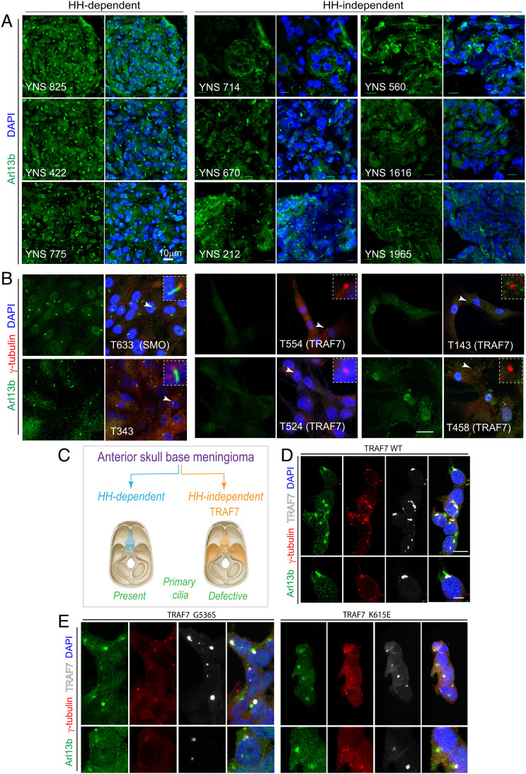 Loss of primary cilia in TRAF7-driven meningiomas. (A) Meningiomas that are either HH-dependent or -independent [based on microarray analysis, (31)] stained for Arl13b (primary cilia) and DNA (DAPI). Confocal immunofluorescence microscopy reveals that HH-dependent tumors express primary cilia, while HH-independent (TRAF7 mutated) tumors display reduced, abrogated, or absence of primary cilia. Genotypes of tumors used YNS 825: SMO L412F; YNS 422 and YNS 775: HH-driven based on gene expression analysis, mutation unknown; YNS 714: TRAF7 unknown mutation/KLF4 K409Q; YNS 670: TRAF7 K498E/KLF4 K409Q; YNS 212: TRAF7 splice-site mutation: c.1135+5G>A/ AKT E17K; YNS 560: AKT1-E17K (± TRAF7); YNS 1616: TRAF7 I368N/KLF4 K409Q; YNS 1965: TRAF7: R653Q/AKT1-E17K. 3D projections of equivalent z-stacks are shown. (Scale bar, 10 μm.) (B) Primary cultures of meningiomas that are either HH-dependent or -independent [based on microarray analysis, (31)] stained for Arl13b (primary cilia) and γ-tubulin (centrosomes, marking base of cilia). Arrowheads indicate region shown at higher magnification in inset. All images captured under identical confocal settings. [Genotypes of cultures used T633 (derived from YNS 825): SMO L412F; T343 (derived from YNS 422) and T596 (derived from YNS 775): HH driven based on gene expression analysis, mutation unknown; T554 (derived from YNS 714): TRAF7 unknown mutation/KLF4 K409Q; T524 (derived from YNS 670): TRAF7 K498E/KLF4 K409Q; T143 (derived from YNS 212): TRAF7 splice-site mutation: c.1135+5G>A/ AKT E17K); T458 (derived from YNS 560): AKT1-E17K (±TRAF7). (Scale bar: 20 μm.) (C) Schematic representation of anatomic localization of HH-dependent (turquoise) and -independent (orange) meningiomas, driver mutations, and primary cilium status. (D–E) Overexpression of V5-tagged WT and mutant (G536S or K615E) TRAF7 in HEK293 cells followed by staining for Arl13b (green), γ-tubulin (red), and V5 (white, marking TRAF7). Only mutant forms of TRAF7 affect the primary cilium. (Scale bar: 20 μm.)