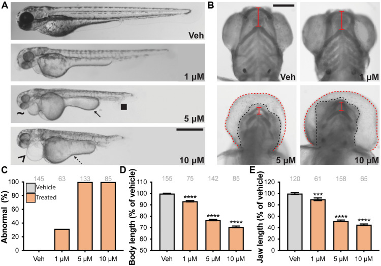 (A and B) WT embryos were treated with different doses of the MAP4K4 inhibitor PF06260933. (A) At 3 dpf, Map4k4 inhibition induced developmental defects including shortening of the body, small eyes (~), cloacal defects (closed square), pericardial edema (^), and thickening of the yolk extension (arrow) or reduced yolk constriction (dashed arrow). Representative lateral images are shown. (B) Representative ventral images of Alcian blue staining of the jaw cartilage at 5 dpf. At higher doses, the swollen hearts obscure the jaw. For clarity, the black dashed line outlines the head, the red dashed line outlines edematous heart, and the solid red line indicates the distance between the ceratohyal and Meckel’s cartilages. (C to E) Quantitation of abnormalities (C), body length (D), and jaw length (E) reveals increasing defects and shortening of both body and jaw in a dose-responsive manner. Scale bars, 500 (A) and 200 μm (B). Graphs: pale gray: vehicle (Veh); orange, drug treated. *P < 0.05; **P < 0.01; ***P < 0.001; ****P < 0.0001 by pairwise Student’s t test (D and E) compared to vehicle. ANOVA gives P < 0.0001 for (D) and (E). n numbers are inset to graphs in gray text. Error bars represent the SEM.