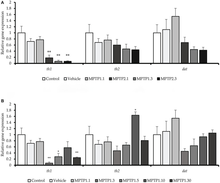 The relative gene expression in the zebrafish model across the group. th1 gene was significantly down-regulated in MPTP1.3, MPTP1.5, MPTP2.1, and MPTP2.3. th2 gene expression was down-regulated initially however was not statistically significant. However, at MPTP1.10, there is a spike in th2 gene expression which eventually down-regulated in MPTP1.30. dat gene was down-regulated, especially in MPTP1.3 and MPTP2.3 then steadily increased afterward; however, these changes were not statistically significant. (A) The relative gene expression between one- and two-time injections. (B) The relative gene expression among MPTP days 1 to 30. Data are presented as mean ± SEM. Asterisks (*) indicate a significant difference between vehicle and treated fish at *p < 0.01 or **p < 0.05.