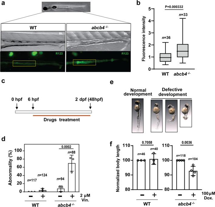 Zebrafish Abcb4 is an efflux transporter of rhodamine123, a substrate for human Pgp. a Fluorescence micrographs indicate the accumulation rhodamine123 in the WT and abcb4 knockout embryos. The intensity of rhodamine123 dye in WT and abcb4 knockout embryos was quantified and illustrated as a bar graph b. c Protocol of drug treatment for vinblastine and doxorubicin toxicity experiments. e Representative images of embryos with defects development after vinblastine treatment. d The percentage of embryos showing developmental abnormalities for WT and abcb4 mutant in the presence and absence of 2 μM vinblastine was compared by two-way ANOVA. eabcb4 knockout embryos treated with 100 µM doxorubicin demonstrate a reduction of body length in a two-tailed t-test. Data are expressed as mean ± SD from at least three independent experiments. n numbers indicate the total number of embryos across the independent experiments