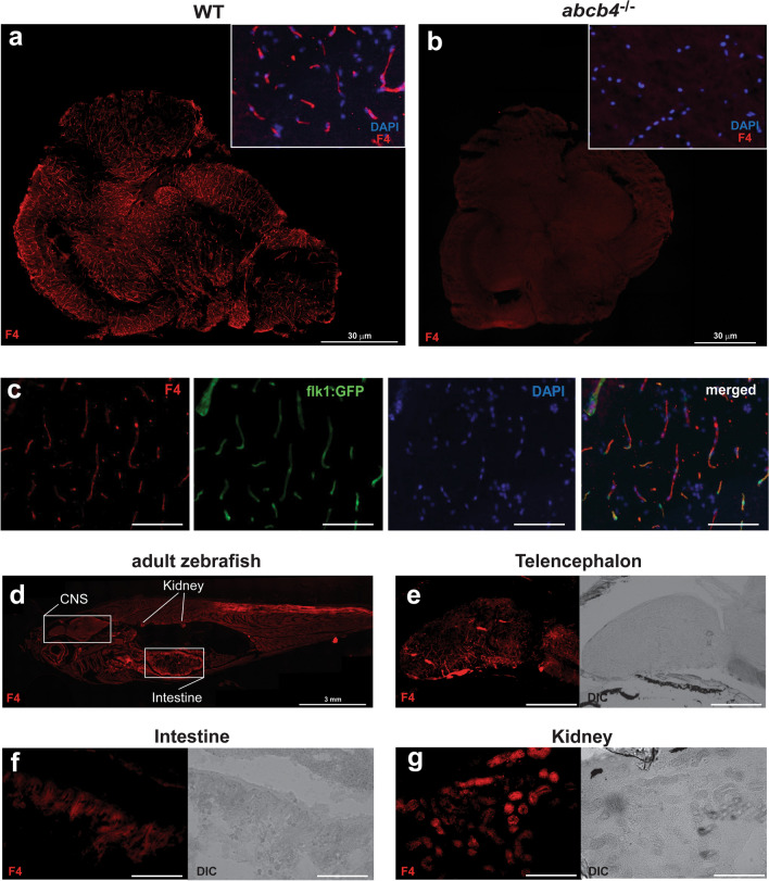 Zebrafish Abcb4 protein localizes to blood vessels in the zebrafish brain. Brain tissues of WT a and abcb4 knockout b adult zebrafish, as a negative control, were stained with anti-Pgp antibody F4 (red) as described in the Materials and Method section. Bar = 30 μm. c F4 antibody staining of whole adult zebrafish. Bar = 3 mm. Positive staining (red) was noted in the forebrain d, intestine e, and a subset of renal tubes or collecting ducts in the kidney f. g The F4 positive staining (red) in the brain colocalized with flk1:GFP positive cells (green). Fluorescence channels were interrogated individually and merged in. Nuclei were stained with DAPI (blue). Bar = 300 μm for (d, e), 200 μm for (f), and 50 μm for (g)