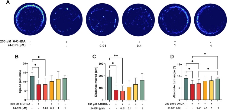 Fig. 4 Fig. 4. Representative locomotion path (A), Speed (B), distance travelled (C), and turning angle (D) of zebrafish larvae at 120 hpf. Values are expressed as mean ± standard deviation (D) or as median and interquartile ranges (B and C) of 10 independent replicates (10 animals per replicate). Statistical analysis was performed using one-way ANOVA followed by Tukey's multiple-comparison test or Kruskal-Wallis followed by Dunn’s test and *, ** indicates significant differences (p < 0.05 and p < 0.01, respectively).