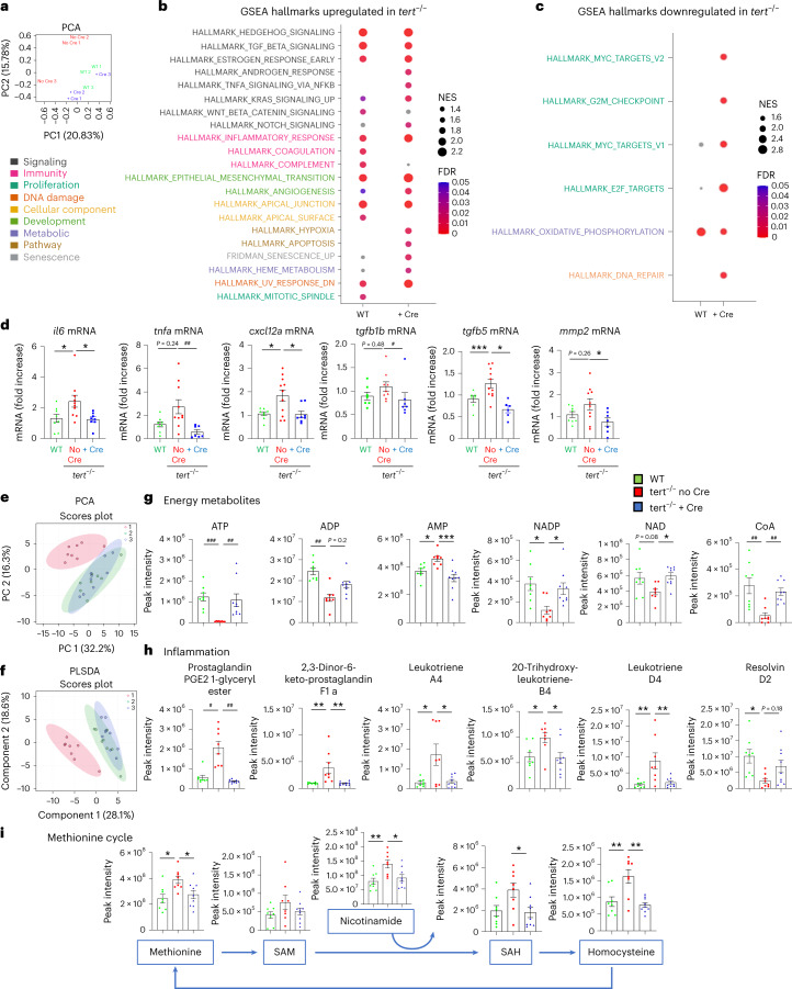 Gut-specific tert expression rescues gut transcriptomics and metabolomics profiles.a, Principal component analysis (PCA)-based on untargeted transcriptomics data of 9-month-old gut samples. A clustering between tert−/− + Cre and WT was observed while the tert−/− no Cre group was clearly distinguishable from tert−/− no Cre fish (n = 3 per group). b,c, Identification of upregulated (b) or downregulated (c) hallmarks in tert−/− no Cre compared to either WT or tert−/− + Cre, based on GSEA. The normalized enrichment scores (NES) depict to what degree the pathway genes are overrepresented in WT or tert−/− + Cre, compared to tert−/− no Cre. Gene sets related to senescence, inflammation and morphogenesis were enriched while the hallmarks of proliferation and oxidative phosphorylation were downregulated in the gut of tert−/− no Cre fish compared to the other two groups. d, RT–qPCR analysis of inflammation-related gene expression (il6, tnfa, tgfb1b and tgfb5) and SASP-related gene expression (il6, tnfa, cxcl12a, tgfb1b, tgfb5 and mmp2) in 9-month-old gut samples (nWT = 8 fish, 𝑛𝑡𝑒𝑟𝑡−/−noCre = 10 fish and 𝑛𝑡𝑒𝑟𝑡−/−+Cre = 8 fish for il6; nWT = 8 fish, 𝑛𝑡𝑒𝑟𝑡−/−noCre = 9 fish and 𝑛𝑡𝑒𝑟𝑡−/−+Cre = 8 fish for tnfa; nWT = 8 fish, 𝑛𝑡𝑒𝑟𝑡−/−noCre = 11 fish and 𝑛𝑡𝑒𝑟𝑡−/−+Cre = 8 fish for cxcl12; nWT = 7 fish, 𝑛𝑡𝑒𝑟𝑡−/−noCre = 9 fish and 𝑛𝑡𝑒𝑟𝑡−/−+Cre = 7 fish for tgfb1b; nWT = 7 fish, 𝑛𝑡𝑒𝑟𝑡−/−noCre = 11 fish and 𝑛𝑡𝑒𝑟𝑡−/−+Cre = 6 fish for tgfb5; and nWT = 8 fish, 𝑛𝑡𝑒𝑟𝑡−/−noCre = 10 fish and 𝑛𝑡𝑒𝑟𝑡−/−+Cre = 7 fish for mmp2). e,f, PCA (e) and partial least squares discriminant analysis (PLS-DA) (f) clustering analysis based on untargeted metabolomics data of 9-month-old gut samples. A clustering between tert−/− + Cre and WT was observed while the tert−/− no Cre group was clearly distinguishable from the other (nWT = 8 fish, 𝑛𝑡𝑒𝑟𝑡−/−noCre = 8 fish and 𝑛𝑡𝑒𝑟𝑡−/−+Cre = 9 fish). The score plot is presented with a confidence ellipse of 95%. g–i, Metabolomics analysis of energy metabolites (g), inflammatory metabolites (h) and methionine cycle pathway (i) in 9-month-old gut samples (nWT = 8 fish, 𝑛𝑡𝑒𝑟𝑡−/−noCre = 8 fish and 𝑛𝑡𝑒𝑟𝑡−/−+Cre = 9 fish). All data are presented as the mean ± s.e.m.; *P < 0.05, **P < 0.01, ***P < 0.001, using a one-way ANOVA and post hoc Tukey test; *P < 0.05; *P < 0.01, ***P < 0.001, using a Kruskal–Wallis and post hoc Dunn test).