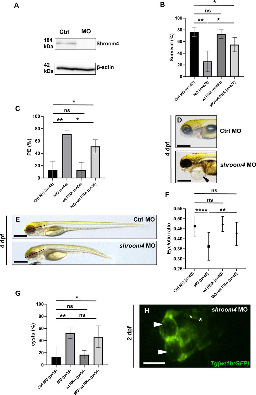 Fig. 3 Knockdown of Shroom4 leads to glomerular cysts, eye abnormalities and PE. (A) Western blot analysis demonstrates a protein decrease in shroom4 MO-injected zfl for Shroom4 (184 kDa, F1Q6C1), derived from transcript shroom4-201, in comparison with Ctrl MO-injected zfl. The protein product for transcript shroom4-202 is too small to be detected by Western blot analysis (11 kDa, B3DGK9). β-Actin serves as Ctrl and shows an equal amount of protein in both samples. (B) Quantification of survival (n=5); zfl injected with shroom4 MO show a significant reduction of survival rate at 5 dpf compared with Ctrl MO. Survival of shroom4 MO is significantly rescued by coinjection of human WT SHROOM4 RNA. No alterations in survival have been observed by solely injecting WT SHROOM4 RNA. (C,D) Quantification of PE (n=3) shows significant occurrence in shroom4 morphants, a phenotype, which could be rescued by co-njection of WT SHROOM4 RNA. Black arrowhead highlights PE observed in a zfl injected with shroom4 MO at 4 dpf. (E,F) Eye-to-head ratio of injected zfl at 4 dpf (n=4). Measurement of the eye (red line) and head (black line, distance between the snout to the otic vesicle) was performed as visualised (F). Injection of shroom4 MO significantly reduced eye-to-head ratio, while WT mRNA co-injection in shroom4 MO-injected zfl significantly rescues the phenotypical effect. (G,H) Zfl injected with shroom4 MO develop glomerular cysts (white arrowheads in H) and dilatation of the pronephric ducts (white asterisks in H) that could not be rescued by human WT RNA (n=4). Images from in vivo observation through fluorescence microscopy (dorsal view) in Tg(wt1b:GFP) were taken at 2 dpf. Scale bars represent 100 µm. Ctrl, control; MO, morpholino oligonucleotide; ns, nonsignificant; PE, pericardial effusion; wt, wild type; zfl, zebrafish larvae. p <0.05 (*), p <0.01 (**), p <0.001 (***)
