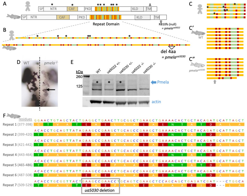 A zebrafish model of pigmentary glaucoma engineered via subtle mutation to the repeat region of the PMEL homolog that forms functional amyloid in pigment cells. (A) Homologs of PMEL protein in human and zebrafish are strikingly similar with a full complement of shared domains, including a repeat domain that contributes to making functional amyloid. Zebrafish Pmela protein is ~25% longer than human PMEL. The repeat domain in PMEL is homologous between human and zebrafish, though the details of which amino acids comprise each repeat are different; colours in panels (A–C) present a simplified schematic of amino acid properties (polarity) in these repeats, with detailed views in panel F and Figure S1. Symbols * and ∆ above human PMEL indicate positions of pigmentary glaucoma patient variants (details in Figure 1), including an enrichment of missense mutations in the repeat domain [1]. (A) Previously engineered zebrafish mutant pmelaua5022 creates a premature stop codon in the N-terminus of zebrafish Pmela, and this is a null allele likely due in part to nonsense-mediated decay [1]. (B,C) Human vs. zebrafish repeat domains (simplified to emphasize repetitive aspects; see Figure S1 for details of exact amino acid content). Here, we engineered a zebrafish mutant ua5030 with an in-frame 12 bp deletion leading to a predicted loss of only 4 residues (“del 4aa”). Panel (C) presents the same protein sequences as panel B but reconfigured to emphasize the repetitive nature of the PMEL repeat domain. Human PMEL contains 5 repeats of 26 amino acids (C), in comparison to zebrafish Pmela (C’), which has 7 repeats of 22 amino acids. Akin to the non-synonymous mutations in pigmentary glaucoma patients (*), the deletion in Pmelaua5030 (C”) is predicted to subtly disrupt the overall protein but alter residues that show a rigidly repetitive character. (D) Pigment defect in larval pmela mutant zebrafish. Dorsal view, anterior at top, merge of wildtype (WT) and mutant larvae to allow side-by-side comparison at dorsal midline (dotted line). (E) Homozygous zebrafish pmela mutant larvae lacked detectable Pmela protein (both alleles). Pmela abundance was perhaps reduced in heterozygous pmela+/ua5022 but appeared similar to WT in heterozygous pmela+/ua5030 larvae. Custom Anti-Pmela antibody was raised against the repeat domain of zebrafish Pmela. (F) Zebrafish Pmela repeat region (NP_001038795.1 residues 377-529) with amino acid properties colour-coded by polarity and stacked to emphasize the rigidity of repeat identity (repeats R1 to R7 are listed alongside their residue numbering). Mutation pmelaua5030 deletes 12 bp to create a 4-residue in-frame deletion. SP = signal peptide; NTR = N-terminal region; CAF = core amyloid fragment; PKD = polycystic kidney domain; KLD = Kringle-like domain; TM = transmembrane domain.