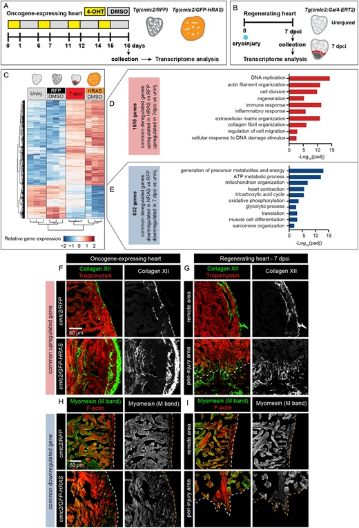 Fig. 5 Commonly deregulated genes in HRAS-OE hearts and regenerating hearts. (A,B) Experimental design for transcriptomic analysis of oncogenic HRAS-expressing hearts (A) and regenerating hearts (B) with the controls. The transgenic strains are indicated above the heart drawing. Three hearts were pooled per samples and biological triplicates were used for each experimental condition. The HRAS-OE heart transcriptome shows similarity with 7 dpci regenerating heart, compared with their controls. (C) Heatmap with hierarchical clustering of log2-transformed normalized read counts for 2250 common differentially expressed (DE) genes in cmlc2/GFP-HRAS and in 7 dpci compared with their relevant control (padj<0.05, absolute fold change >1.5). Columns indicate the expression average of the three replicates for each group. Rows indicate individual genes. Red indicates high expression and blue indicates low expression. (D) Selected enriched gene ontology terms for the 1618 common upregulated genes in HRAS-OE and regenerating hearts representatively shown in C. (E) Selected enriched gene ontology terms for the 632 common downregulated genes in HRAS-OE and regenerating hearts representatively shown in C. (F-I) Immunofluorescence analysis of identified candidate genes commonly deregulated in HRAS-OE and regenerating heart at 7 dpci. (F) Extracellular matrix protein Collagen XII is enriched in the ventricle HRAS-expressing myocardium and the peri-injury zone at 7 dpci. (I) The sarcomeric protein Myomesin is downregulated in the ventricle HRAS-expressing myocardium and the peri-injury zone at 7 dpci. n=5.