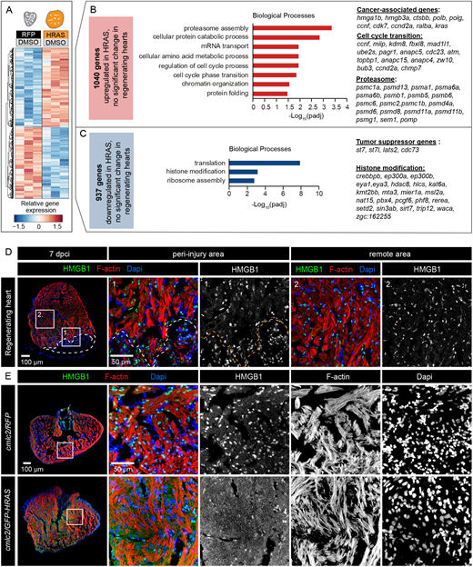 Fig. 6 Unique DE genes of HRAS-OE hearts compared with regenerating hearts. (A) Heatmap of log2-transformed normalized expression values for genes exclusively deregulated in cmlc2/GFP-HRAS compared with cmlc2/RFP, without significant changes in 7 dpci compared with uninjured hearts. (B) Selected enriched gene ontology terms for the 1040 genes exclusively upregulated in HRAS-induced hearts. Cancer-associated, cell cycle transition and proteasome genes are indicated. (C) Selected enriched gene ontology terms for the 937 genes exclusively downregulated in HRAS-induced hearts. Examples of tumor suppressor genes and histone modifiers are listed. (D,E) Immunostaining of regenerating and HRAS-expressing hearts reveals differential subcellular localization of HMGB1. Only in HRAS-OE hearts is this protein non-nuclear. n=4.
