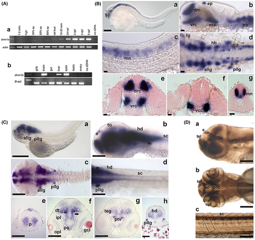 Fig. 2 Panel A. dnm1a spatio-temporal expression. RT-PCR assays using total RNAs extracted from embryos at different embryonic and larval stages (ranging from the first cleavage stages to early larval period) and from different adult organs were performed. (a) During embryo development, dnm1a mRNA was identified starting from the tail bud stage (10 hpf, hours postfertilization) through 5 dpf. Scale bar 250 μm. (b) In the adult, zebrafish dnm1a transcript was detected in the brain, eyes, and liver. Scale bar 250 μm. (c–g) Scale bar 250 μm. Panels B and C. dnm1a spatial expression pattern during zebrafish embryonic development. (B, a, e and f) At 24 hpf dnm1a transcript was localized in the epiphysis and in three large bilateral clusters in anterior telencephalon (dorso rostral cluster, drc) and on the floor of the diencephalon (ventro rostral cluster, vrc) and mesencephalon (ventro caudal cluster, vcc). (B, b–d and g) Strong signals were detected in the hindbrain and in the spinal cord. (B, c and g) Transverse histological sections of 24 hpf stained embryos at trunk level revealed that dnm1a was expressed in the medio-ventral portion of the spinal cord, corresponding to the area of developing motor neuron nuclei (mn). (B, d) At 24 hpf dnm1a transcript is present in six bilateral spots, corresponding to the anterior and posterior lateral line (allg and pllg) and trigeminal ganglia (tg). During later stages, dnm1a expression is visible in the cephalic regions of the CNS and in the ganglia-like structures. Scale bar 100 μm. (C, b and d) Starting from 2 dpf a hybridization signal in the spinal cord was detected only after an extended staining reaction time (sc). (C, e–h) Telencephalon transverse histological sections of 2 and 5 dpf larvae showed dnm1a expressing cells localized in the pallium area (p). (C, f) dnm1a is present in the preoptic area (po), and in the hypothalamus. (C, g and f) A strong signal is present in two areas corresponding to the ventral part of the posterior tuberculum (ptv) and to the dorsal thalamus (dt). (C, g) dnm1a expressing cells are visible in the mesencephalon tegmentum (teg). (C, b) dnm1a presented a slight expression in the optic tectum (to). (C, h) dnm1a signal is present in the hindbrain (hd). Panel D. Dnm1a protein localization during embryonic development. (a and b) Immunopositive spots, corresponding to developing glomeruli, in the telencephalon (tel), were observed in embryos at the developmental stage of 3 days postfertilization. Dnm1a signal is present in the hindbrain and in the spinal cord, localized in the anterior and postoptic commissures (ac and poc). (b) At 3 dpf, an increase in Dnm1a signal was observed in the retina (IPL and OPL). (c) A faint signal was detected in motor neuron axons and in cephalic structures similar to ganglia. Scale bar 250 μm.