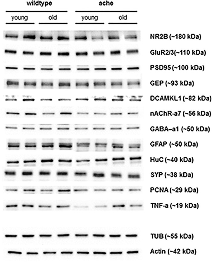 Representative Western blot images for cellular, synaptic, and inflammatory proteins that were used in the current study to examine the effects of genotype and age. All antibodies gave bands at their expected molecular weights.