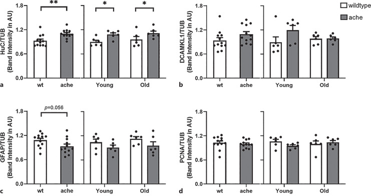 Relative levels of neuronal, glial, and proliferation markers between genotype and age groups.