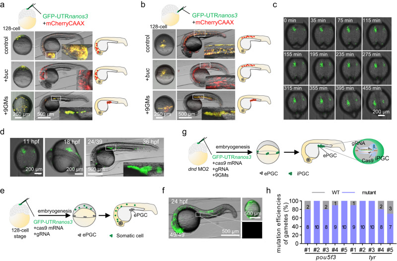 Injection of 9GM or buc mRNA into a single blastomere at the animal pole (a) or margin (b) of a 128-cell embryo. GFP-UTRnanos3 was used to label iPGCs, and mCherryCAAX was used to label injected cells. c Time-lapse of iPGC migration to the genital ridges after single blastomere injection. d Single blastomere-induced iPGCs migrated to the genital ridge. e, f Genome editing was performed in one blastomere at 128-cell stage without iPGC induction. Eventually, these genome-edited cells migrated to other parts of the body besides the genital ridge. g Schematic representation of simultaneous genome editing and iPGC induction in a single blastomere at 128-cell stage. Embryos were injected with a low dose of dnd MO2 (20 µM) at 1-cell stage to eliminate the endogenous PGC, and the single blastomere induced iPGCs developed into genome-edited gametes. h Mutation efficiencies of gametes originated from single blastomere induced iPGCs. For each fish, a total of 10 embryos obtained from the hybridization of genome-edited sperm originated from single blastomere induced iPGCs and wild-type eggs were analyzed. The mutation efficiency of 5 F0 fish (#1–#5) gametes is shown for each gene. A representative example of three replicate is shown.