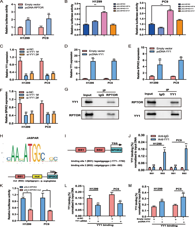The RPTOR-regulated SPHK2/S1P pathway via binding to transcription factor YY1. A Dual-luciferase reporter assays indicated that RPTOR enhanced SPHK2 expression in H1299 and PC9 cell lines. B Transcription factor YY1 was screened to significantly enhance the transcriptional activity of SPHK2 when compared with other candidate transcription factors like HIF1A and ETV7, when co-transfected with pGL3-SPHK2. C-F qRT-PCR assays revealed a positive correlation between SPHK2 and YY1 expression, with both YY1 and SPHK2 expression down-regulated after treatmenting PC9 and H1299 cells with pcDNA-YY1 or YY1 siRNA. G Co-IP assays showed mutual interactions between RPTOR and YY1 in lung cancer cell lines. H–K The JASPAR database was used to predict YY1-binding sites in the SPHK2 promoter sequences. BS1 and BS2 were predicted to be YY1-binding sites, with BS2 at -353 ~ -365 nt of SPHK2 reporting a greater DNA enrichment by ChIP assays. The enrichment of SPHK2 DNA was reduced by mutation of BS2, confirming that BS2 is the site in the SPHK2 promoter bound by YY1. L-M Effect of YY1 expression on SPHK2 promoter sequences. YY1 enriched fewer SPHK2 promoter sequences after si-YY1 1# transfection but more sequences after pcDNA-YY1 transfection