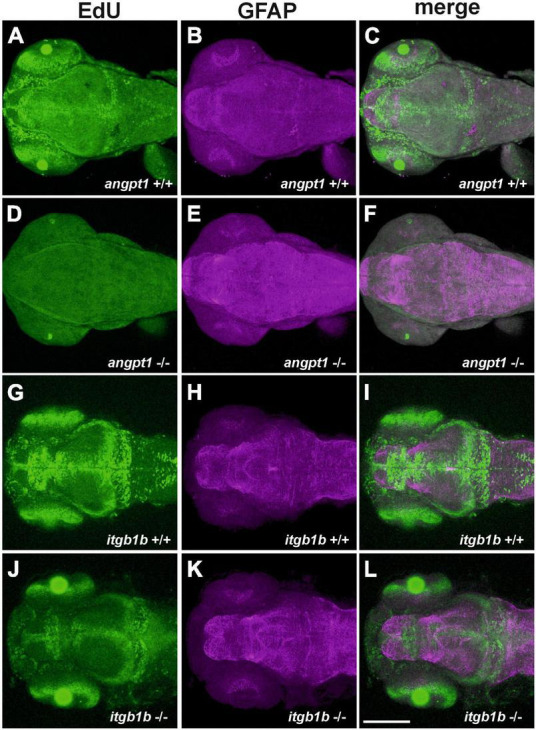 Decreased proliferation and increased gfap intensity in angpt1–/– and itgb1b–/– larvae. Maximum intensity projections of confocal z-stack images were made by immunostaining GFAP following the EdU proliferation assay in 3-dpf genotyped larvae. EdU labeling results shown in (A)angpt1+/+(D)angpt1–/–(G)itgb1b+/+ and (J)itgb1b–/– larval brains. gfap-immunoreactivity results shown in (B)angpt1+/+(E)angpt1–/–(H)itgb1b+/+ and (K)itgb1b–/– larval brains. The merge images of Edu-labeling and gfap-positive are shown in (C)angpt1+/+(F)angpt1–/–(I)itgb1b+/+ and (L)itgb1b–/– larval brains. Proliferating cells are indicated in green, and gfap-positive signals are in magenta. N = 5 per genotyped group. Scale bars are 200 μm.