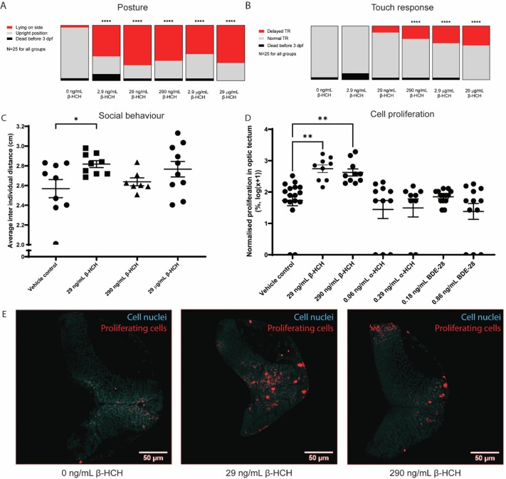 Fig. 4 Effects of β-HCH on early developmental stage zebrafish larvae. A) Distribution of larval posture at 3 days post fertilization after exposure to β-HCH in early developmental stages. B) Distribution of larval touch response at 3 days post fertilization after exposure to β-HCH. Significance was calculated using Chi-square test. C) Effect of β-HCH on shoaling behavior in 7 days post fertilization larvae. 0 ng/mL control: N = 9; 29 ng/mL: N = 9; 290 ng/mL: N = 7; 29 μg/mL: N = 10. Error bars represent S.E.M., significance was calculated using one-way ANOVA with Dunnett’s post-test. D) Effect of β-HCH on cell proliferation in the optic tectum of 5 days post fertilization larvae. BrdU signal labelling proliferating cells was normalised to the mean of vehicle treated larvae and log transformed. 0 ng/mL control: N = 17; 29 ng/mL: N = 9; 290 ng/mL: N = 10. 0.06 ng/mL α-HCH: N = 11; 0.29 ng/mL α-HCH: N = 9; 0.18 ng/mL BDE-28: N = 14, 0.86 ng/mL BDE-28: N = 11. Error bars represent S.E.M., significance was calculated using a Kruskal-Wallis H test with Dunn’s post-test. E) Representative images of BrdU staining in optic tectum of 5 days post fertilization larvae after β-HCH treatment. Red: BrdU-labeled proliferating cells, cyan: nuclear staining. (For interpretation of the references to colour in this figure legend, the reader is referred to the web version of this article.)