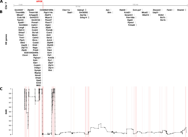 The relationship between DE genes and DAR along the entirety of mouse Chromosome 7 between male