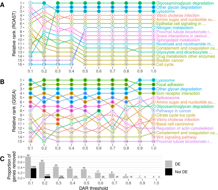 Fig 7 The impact of gene exclusion by DAR thresholding on the outcomes of functional enrichment analysis using KEGG gene sets.