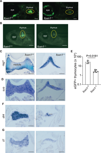 Fig. 2 Impaired intrathymic lymphopoiesis in foxn1-deficient fish. (A) Whole mount depiction of zebrafish at 6 dpf, transgenic for an ikzf1:eGFP pan-lymphocyte reporter transgene. The foxn1 genotypes are indicated, as are anatomical landmarks; note that subpopulations of neurons also express ikzf1. Scale = 0.1 mm. (B) Macroscopic appearance of adult fish (6 weeks of age) transgenic for the ikzf1:eGFP reporter transgene. The foxn1 genotypes are indicated. Scale = 1 mm. (C) RNA in situ hybridization of thymic tissue sections using a rag1-specific probe. Note that the medulla (rag1-negative region) is barely visible in the mutants. (D) RNA in situ hybridization of thymic tissue sections using a tcrb-specific probe. (E) Adult mutant fish (6 weeks of age) possess fewer eGFP-positive thymocytes as determined by flow cytometry on cells isolated from microdissected thymic lobes (mean ± s.e.m. are shown; t-test, two-tailed). Each data point represents an individual fish. (F) RNA in situ hybridization of thymic tissue sections using a dll4-specific probe. (G) RNA in situ hybridization of thymic tissue sections using an il7-specific probe. For C, D, F, G, scale, 0.1 mm.