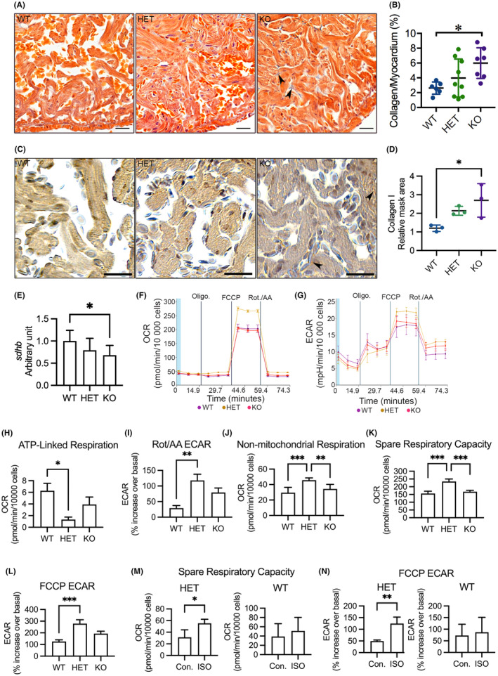 Analyses of myocardial interstitial fibrosis, cardiac OXPHOS gene expression and mitochondrial respiration in adult cardiomyocytes. (A) Representative images of acid fuchsin orange G (AFOG) staining of ventricular sections showing accumulation of collagen (blue) in the myocardium (orange). Arrowhead indicates accumulated collagen. (B) Quantification of AFOG staining indicating increased collagen accumulation in the myocardium in KO(52del). WT