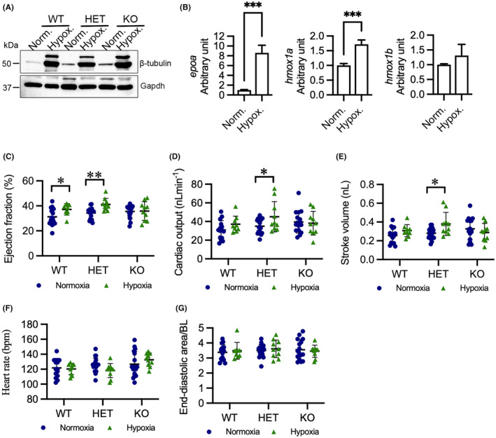 Hypoxia enhances cardiac output in HET(52del) larvae. (A) Representative immunoblots of β‐tubulin and Gapdh in WT, HET(52del), and KO(52del) at normoxic and hypoxic (3% O2 for 24 h) conditions. Gapdh serves as an internal control. Norm. normoxia; Hypox. Hypoxia. (B) RT‐qPCR analyses indicate that hypoxia induces upregulation of
