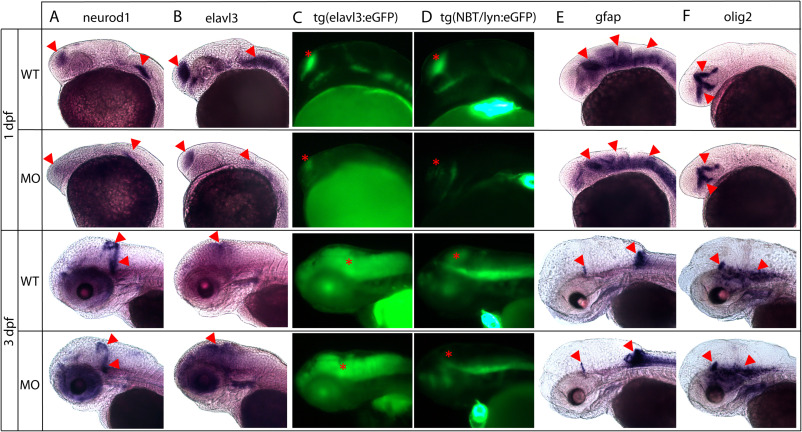 Fig. 5 ASS1 deficiency is associated with a specific neuronal differentiation defect. At the 1-cell stage, wildtype or transgenic zebrafish larvae [tg(elavl3:eGFP) or tg(NBT/lyn:eGFP)] were either injected with ASS1-targeting MO or mock and subjected to ISH applying the indicated probes for mRNA detection (A-B, E-F) or in vivo imaging using a binocular fluorescence microscope (Csingle bondD, MZ16F, Leica) at 1 or 3 dpf. Lateral view with anterior to the left (A-F). ASS1-deficient zebrafish larvae exhibited reduced expression of pro-neuronal markers neurod1 and elavl3 at 1 and 3 dpf (A, B). Analogously, MO-injected transgenic zebrafish larvae expressing eGFP under control of the elavl3 promoter showed almost absent eGFP-expression at 1 dpf, which was partially restored at 3 dpf (C). However, ASS1-deficient tg(NBT/lyn:eGFP) transgenic zebrafish exhibited constantly reduced neuronal eGFP expression until 3 dpf as indicator of reduced neuronal cell mass (D). In contrast, glial cell markers gfap (astrocytes) and olig2 (oligodendrocytes) remained unchanged in response to ASS1 deficiency when compared to wildtype control (E, F). Important ISH-staining patterns are marked with arrow head(s) in the wildtype and MO-treated cohort (A, B, E, F). Distinct GFP-expression patterns of the transgenic tg(elavl3:eGFP) (C) or tg(NBT/lyn:eGFP) (D) zebrafish strains are marked with an asterisk in both cohorts.